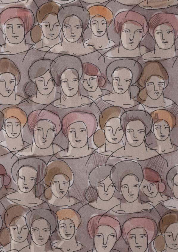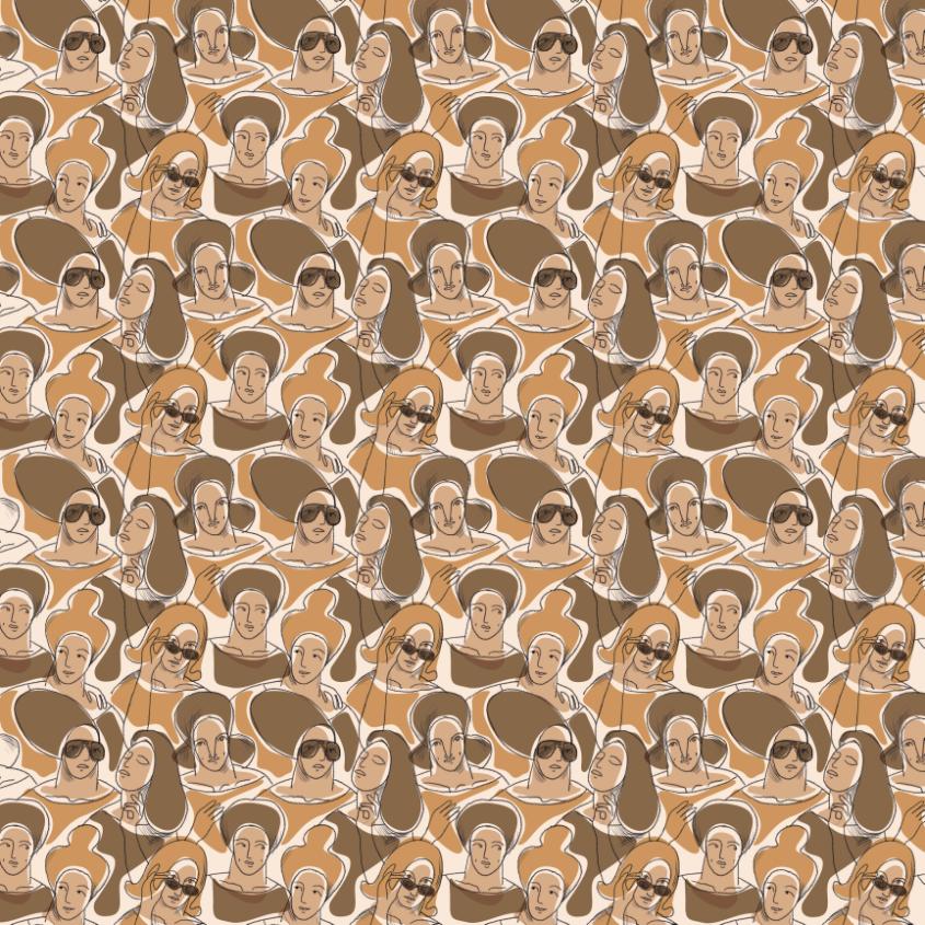 Mönstret är uppbyggt av individuella former som smälter samman till ett mjukt, kamouflage‑liknande landskap. Kamouflage omtolkas här från något konfliktfyllt till något inkluderande: ett uttryck för skydd, gemenskap och tillhörighet. Resultatet är organiskt, lugnt och mänskligt.